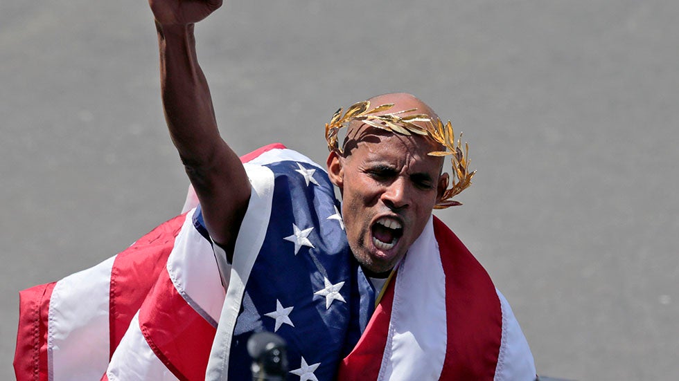 Meb Keflezighi, of San Diego, Calif., celebrates his victory in the 118th Boston Marathon Monday, April 21, 2014 in Boston. (AP Photo/Charles Krupa)
