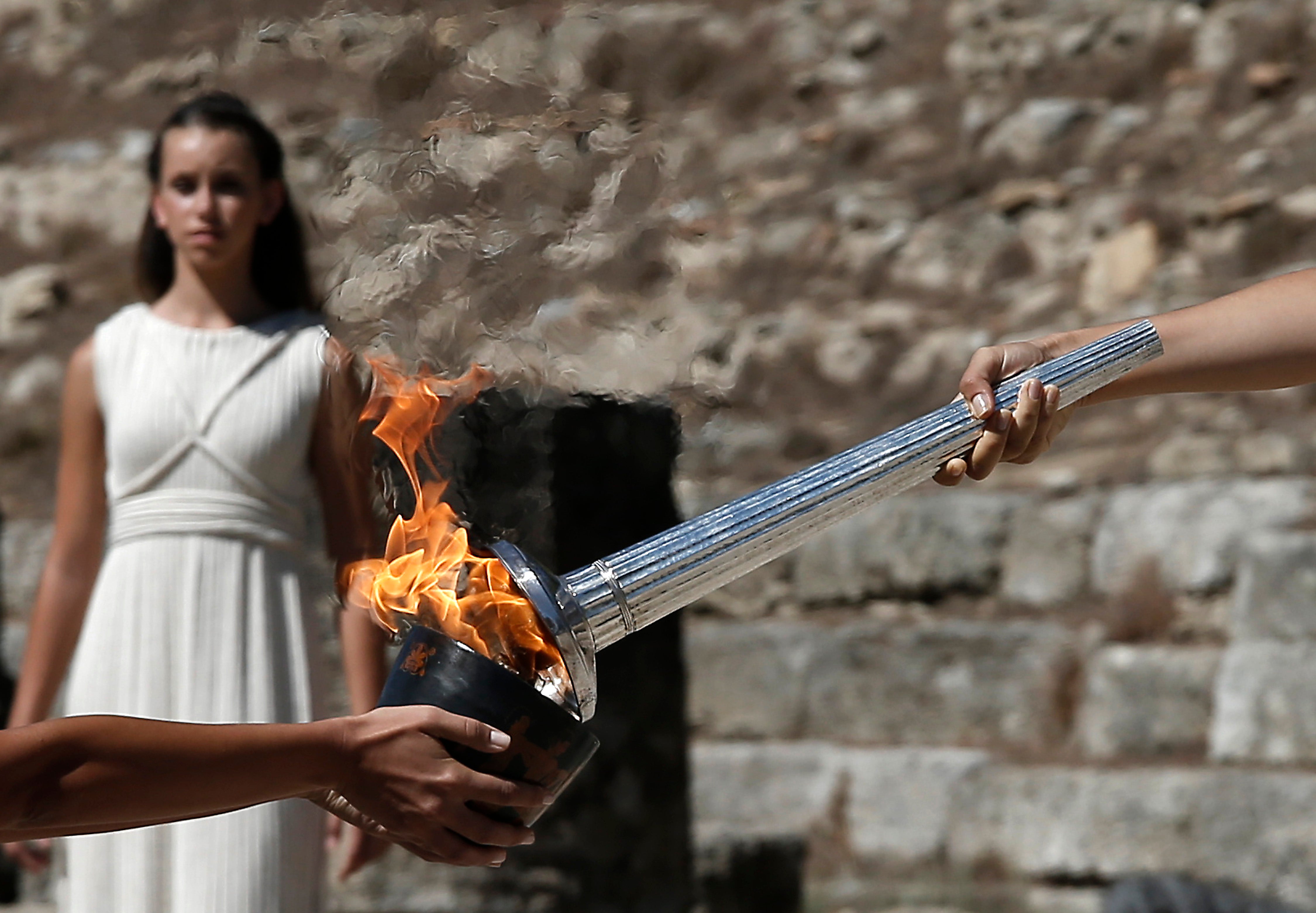 The ceremony was held with actresses dressed as ancient priestesses at the birthplace of the Greek games held in antiquity, with the flame lighting using a parabolic mirror.