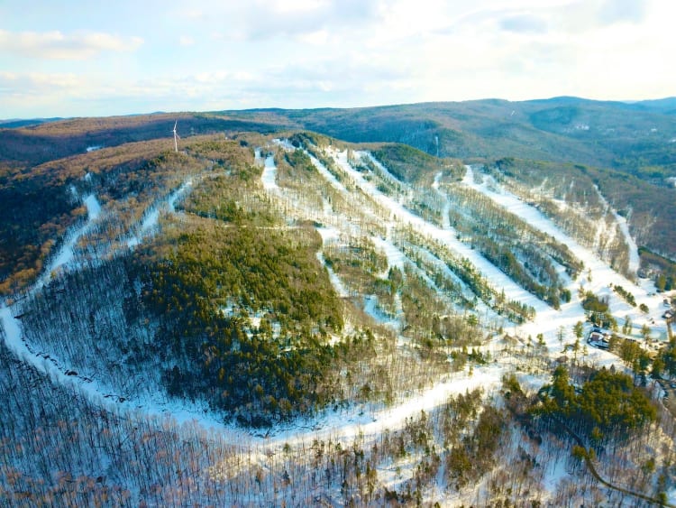 Berkshire East’s wind turbine is visible near the top of the mountain.
