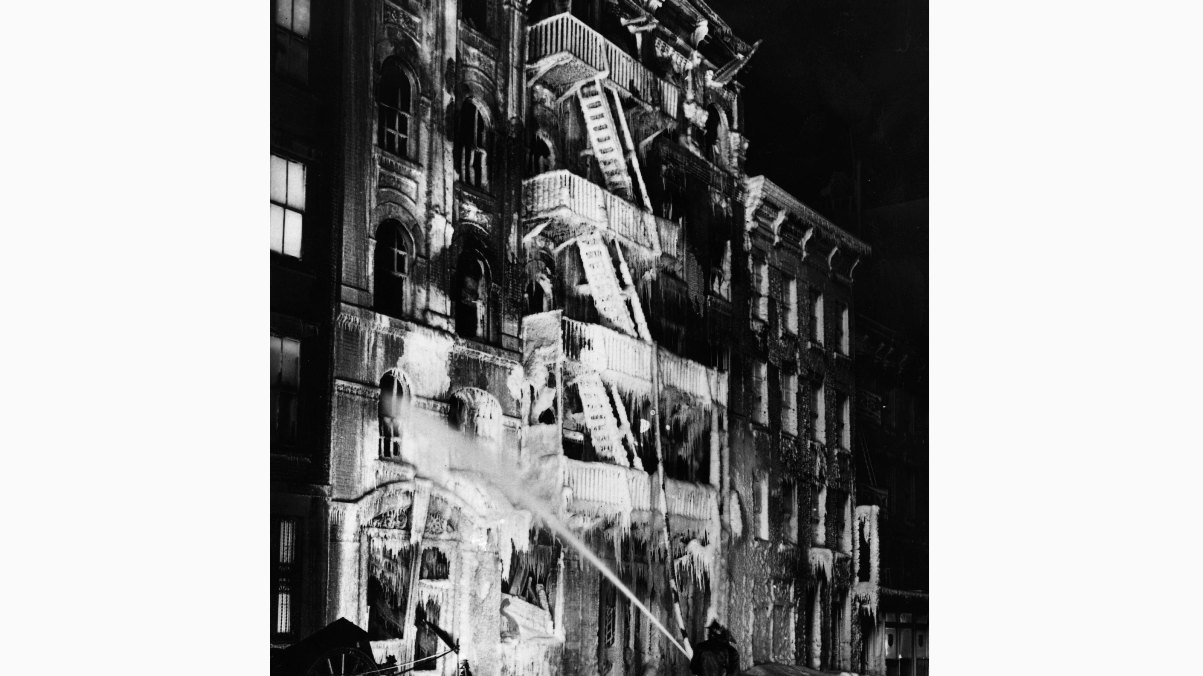 A factory building on East 120th Street, New York, coated with ice after firemen put out a fierce fire, circa 1926.