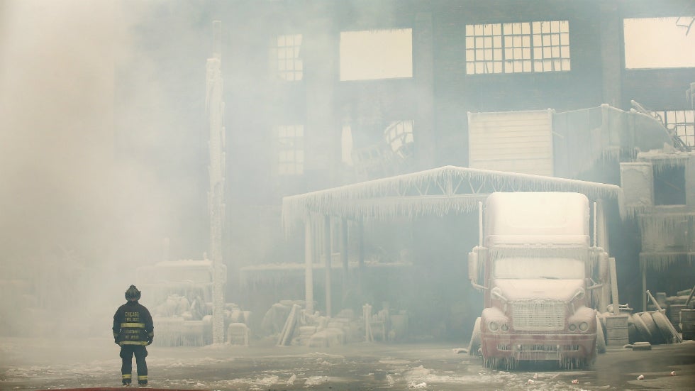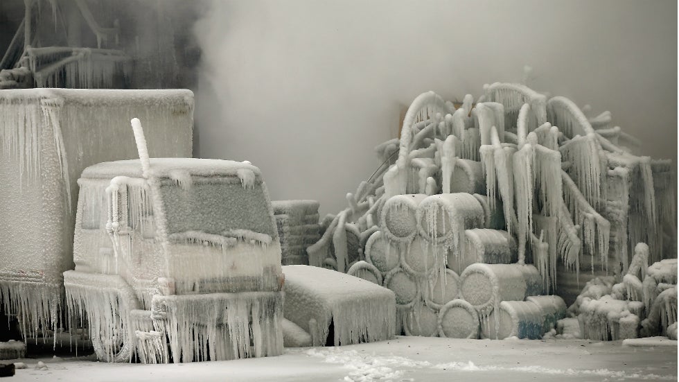 A truck and chemical drums are covered with ice as firefighters help to extinguish a massive blaze at a vacant warehouse on Jan. 23, 2013, in Chicago.