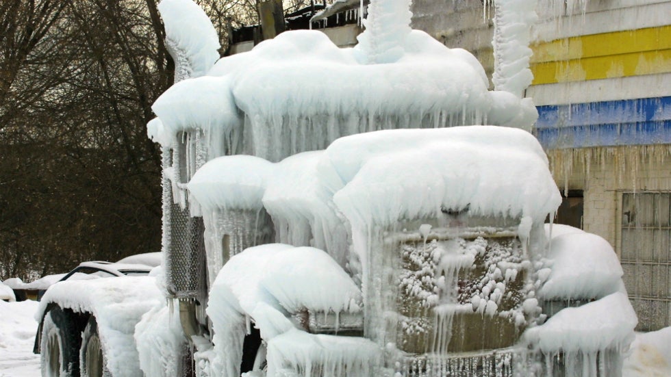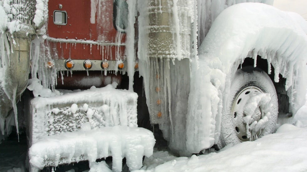 A truck is covered in ice as firefighters help to extinguish a massive blaze at a vacant warehouse on Jan. 23, 2013, in Chicago.