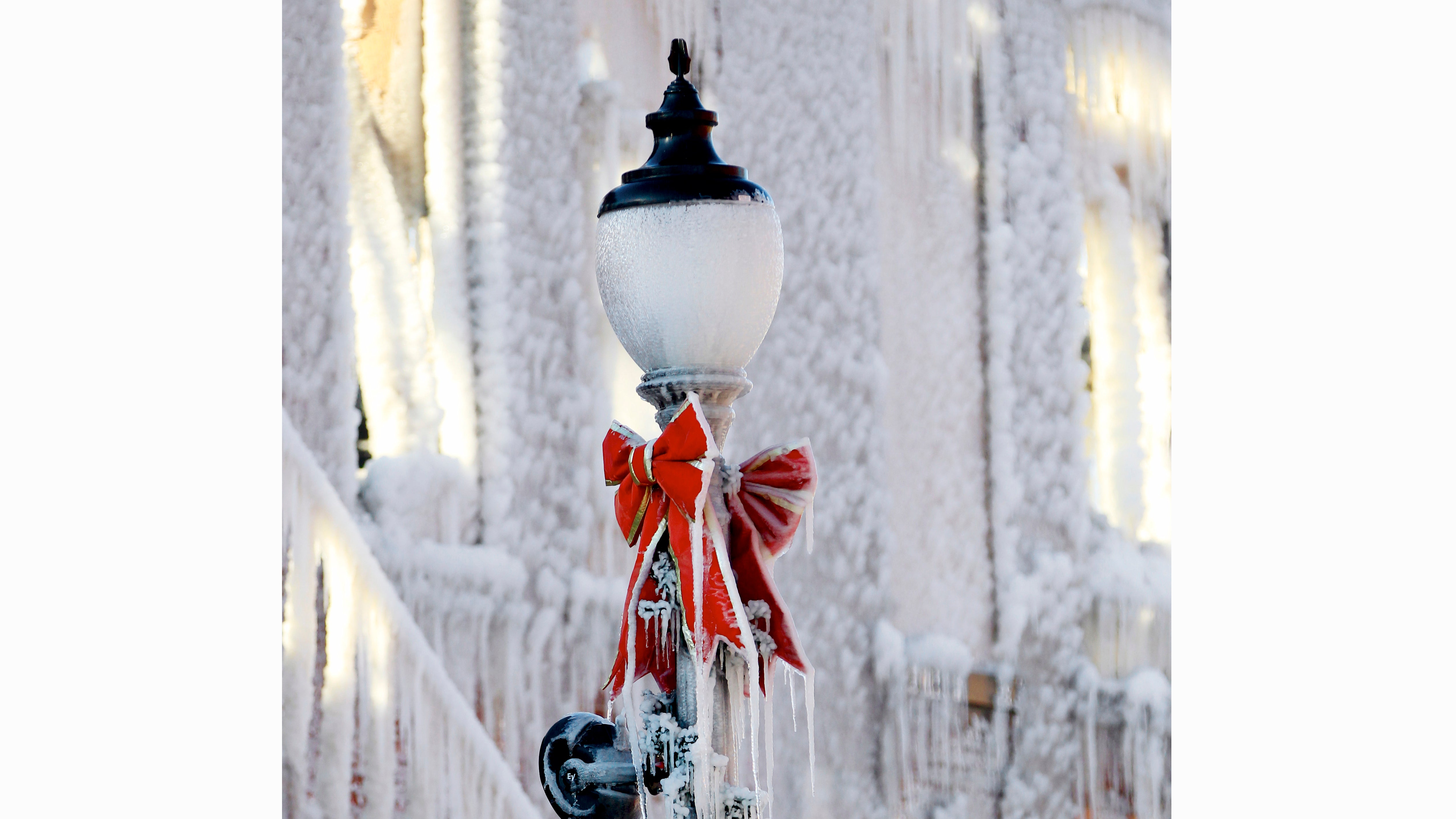 A street light is covered with icicles near a building that caught on fire in Plattsmouth, Neb., Friday, Jan. 3, 2014. The water sprayed on it by firefighters froze.