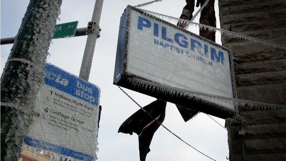 Ice hangs from the sign on the landmark Pilgrim Baptist Church after the building burned Friday, Jan. 7, 2006, in Chicago.