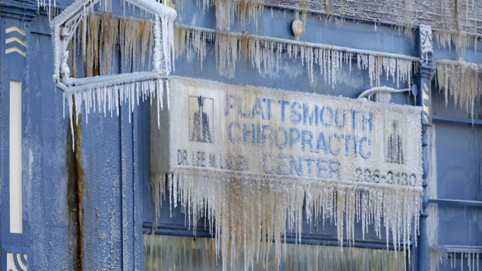 The Plattsmouth Chiropractic Center is decorated with icicles after an adjacent building caught on fire in Plattsmouth, Neb., Friday, Jan. 3, 2014, and the water sprayed on it by firefighters froze.