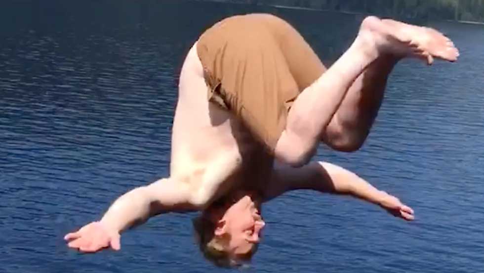 A guy creates his own meteorological phenomenon by performing a not so perfect front flip ending with a belly flop.
