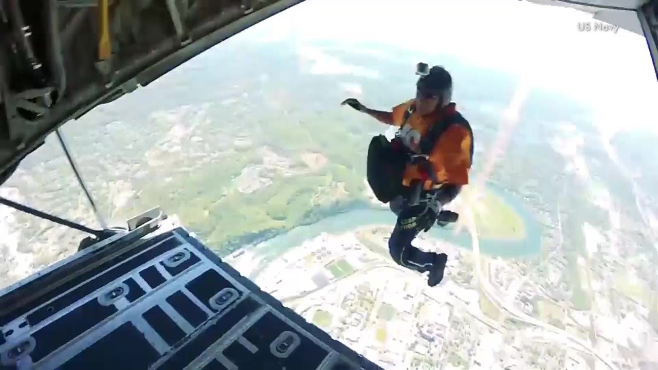 Members of the U.S. Navy Leap Frogs team skydive into Tennessee’s Neyland stadium.