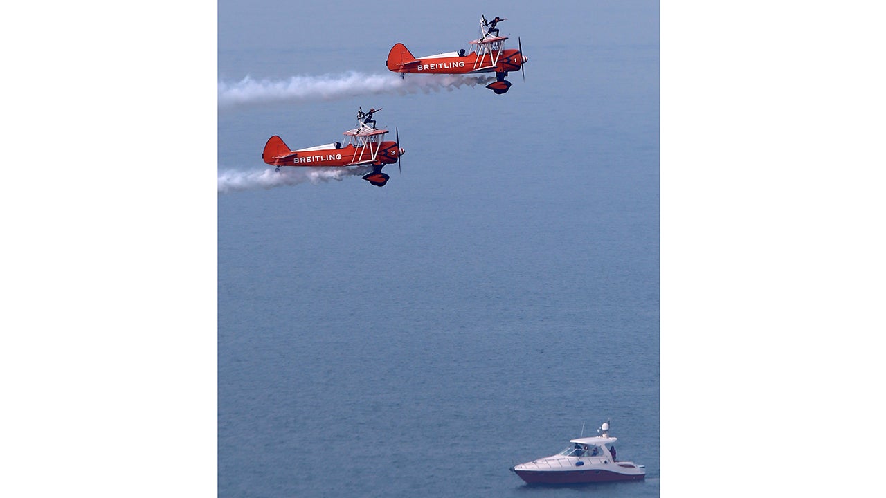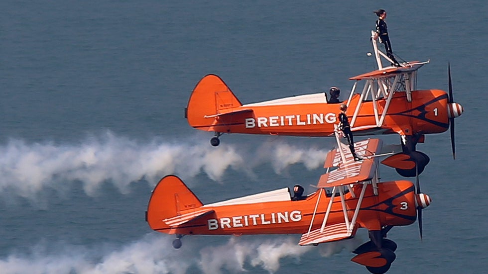 The UK-based Breitling Wingwalkers display gravity-defying stunts in the air.