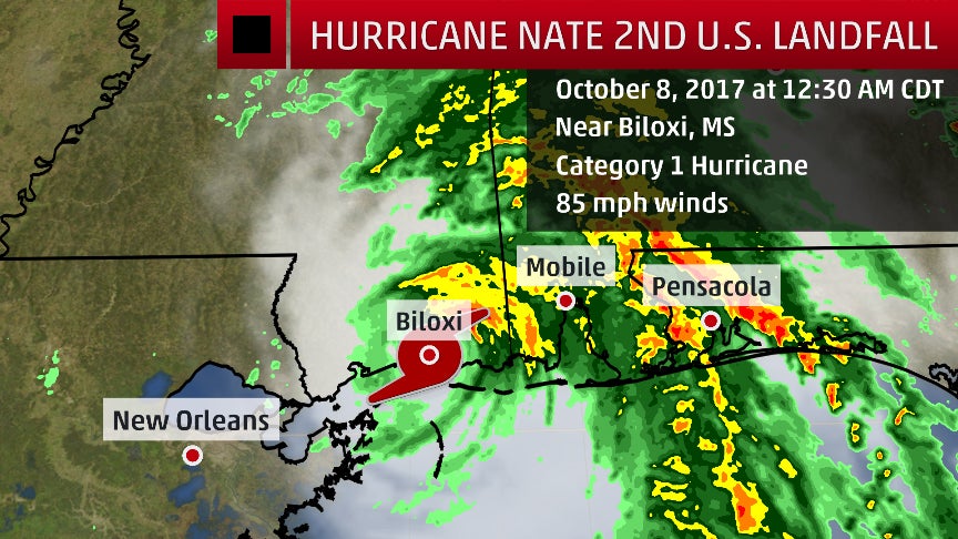 Nate then made its second and final U.S. landfall around 12:30 a.m. CDT Oct. 8 as a Category 1 hurricane near Biloxi, Mississippi.