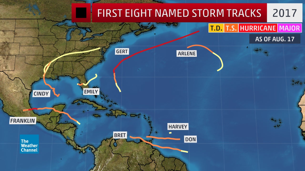 Atlantic named storm tracks in 2017, through Aug. 17.