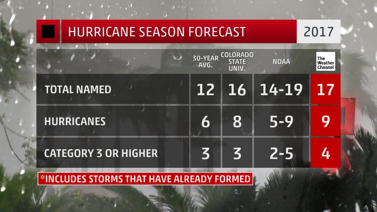 In its final outlook update released Tuesday, The Weather Company said it now expects 17 named storms throughout the season, including nine hurricanes and four major hurricanes of Category 3 or greater intensity.