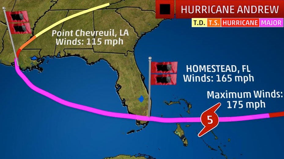 Hurricane Andrew tore through South Florida as a Category 5 and then made a second landfall in southern Louisiana as a Category 3 in August 1992.