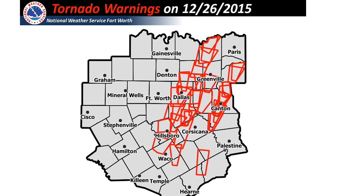 The red outlines show tornado warnings that were issued in north-central Texas Dec. 26, 2015. (NOAA)