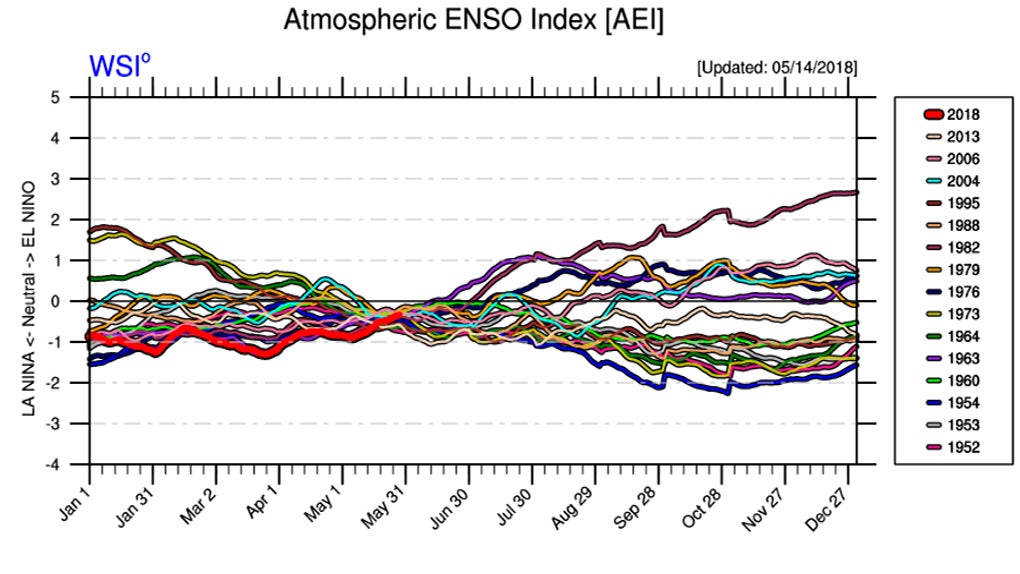 The latest outlook from the Climate Prediction Center, released May 10, forecasts neutral conditions to last through the end of hurricane season before El Niño conditions potentially take over this winter. As we have seen so far in 2018, a gentle warming of the equatorial Pacific is anticipated through the end of the year.