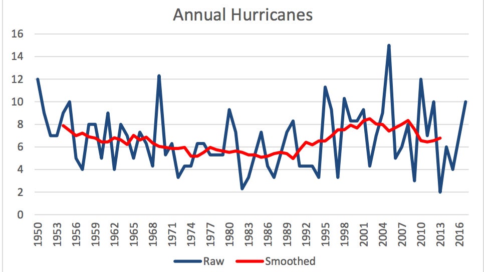 The number of Atlantic hurricanes by year from 1950 to 2016.