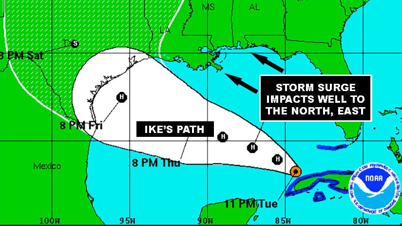Ike's path was directly into the Texas coast in 2008, but storm surge inundation occurred as far east as southeastern Louisiana, Mississippi, Alabama and the Florida Panhandle. (NOAA)