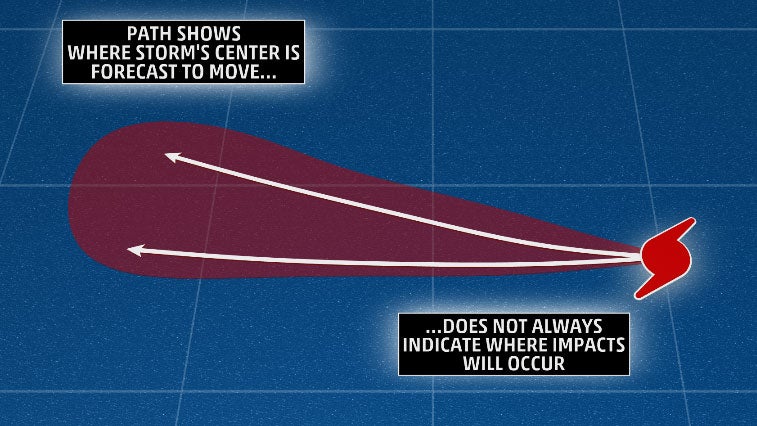 What the forecast path does not show is that significant impacts from a tropical storm or hurricane, including flooding rainfall, storm surge, strong winds and tornadoes, can occur well outside of where this so-called cone is plotted on a map.