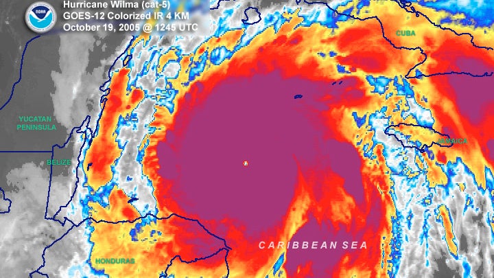 The tiny eye of Hurricane Wilma on Oct. 19, 2005 when it was a Category 5. (NOAA)