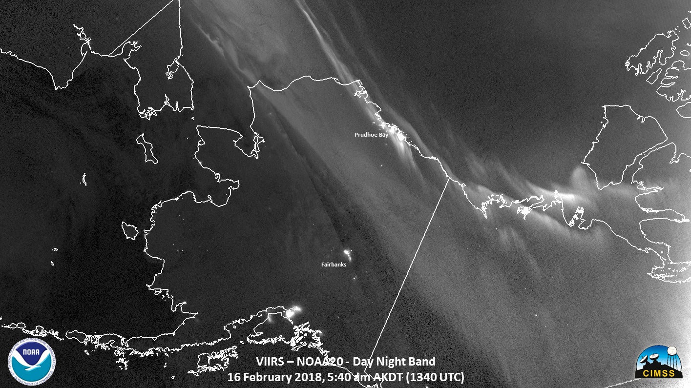 Nighttime visible imagery on a clear night in Alaska. The northern lights are visible over northern Alaska.