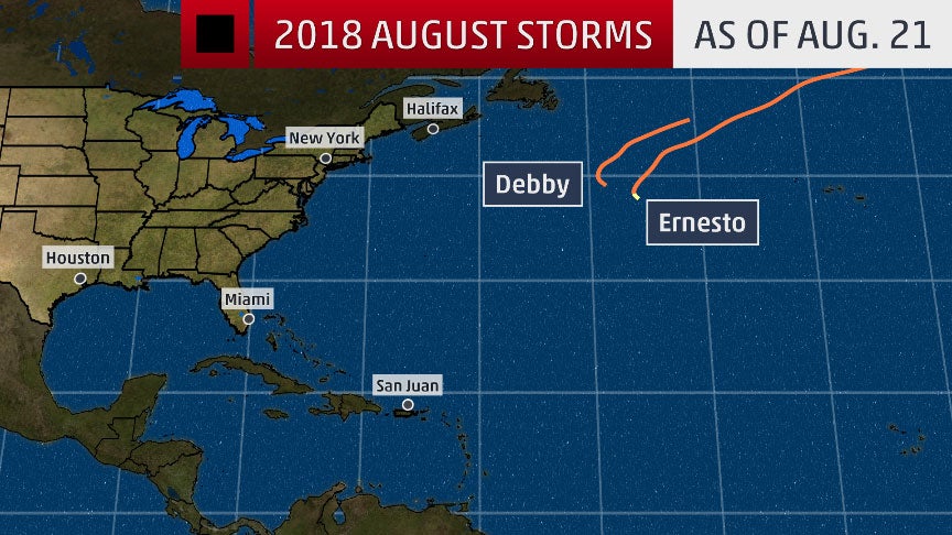 Two tropical storms, Debby and Ernesto, have formed so far this month, but they were far away from land in the northern Atlantic Ocean. Neither of them was in an area where conditions in the atmosphere and ocean would allow them to strengthen into hurricanes.