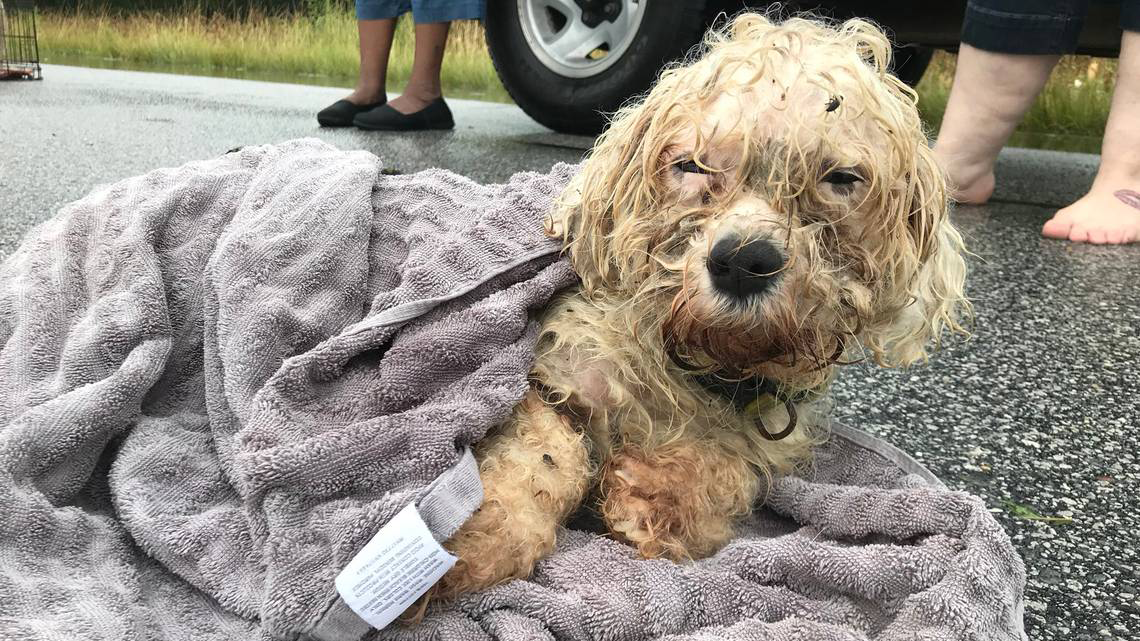 Blocked by a flooded road, April Casey heard barking and whimpering she couldn't ignore.