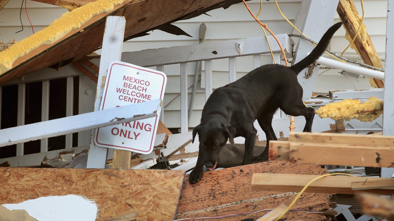 A dog with the Maryland Task Force urban search and rescue team searches for victims of Hurricane Michael on Oct. 16, 2018 in Mexico Beach, Florida.