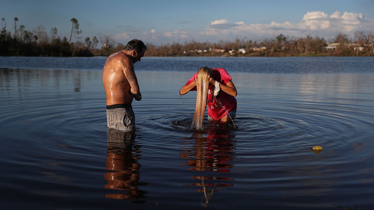 Justin Norman and Lisa Salle wash in Lake Martin because their home has no running water after much of the municipality's infrastructure was damaged by Hurricane Michael, Oct. 16, 2018 in Panama City, Florida.