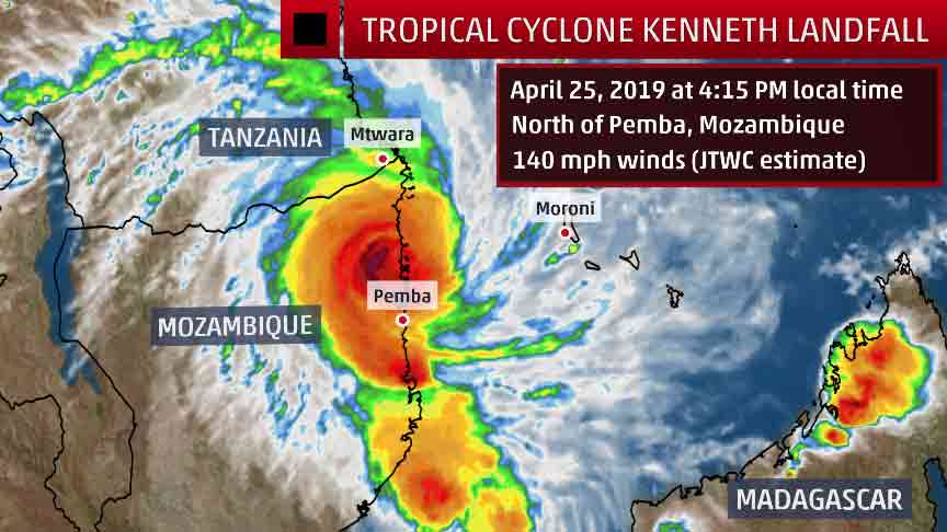 Tropical Cyclone Kenneth made landfall in northern Mozambique at approximately 4:15 p.m. local time Wednesday, April 25, 2019.