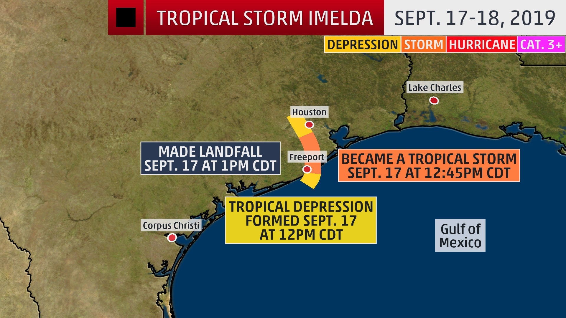 The disturbance developed an organized area of low pressure near the coast of Texas on Sept. 17 and was designated Tropical Depression Eleven by the National Hurricane Center at 12 p.m. CDT. Roughly 45 minutes later, the system was upgraded to Tropical Storm Imelda and made landfall 15 minutes later at 1 p.m. CDT.