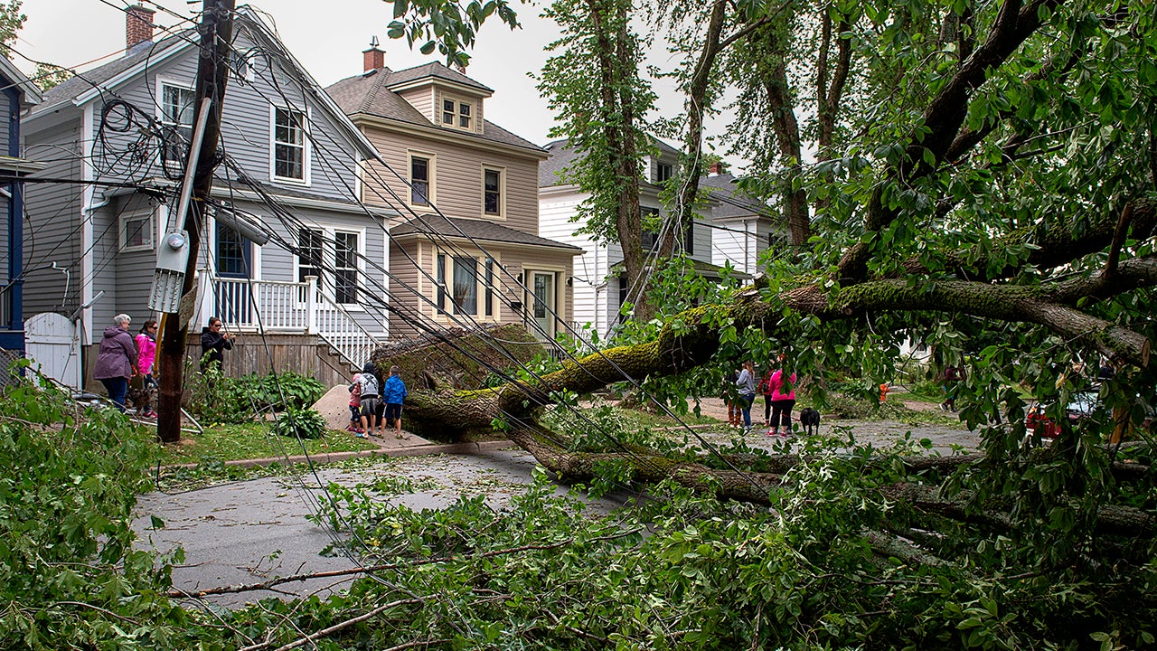 A street is blocked by fallen trees as a result of Hurricane Dorian pounding the area with heavy rain and wind in Halifax, Nova Scotia, on Sunday, Sept. 8, 2019.