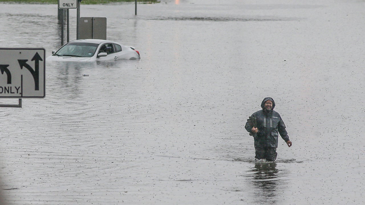 A man walks through the flooded feeder roads Highway 69 North on Sept. 19, 2019, in Houston, Texas.