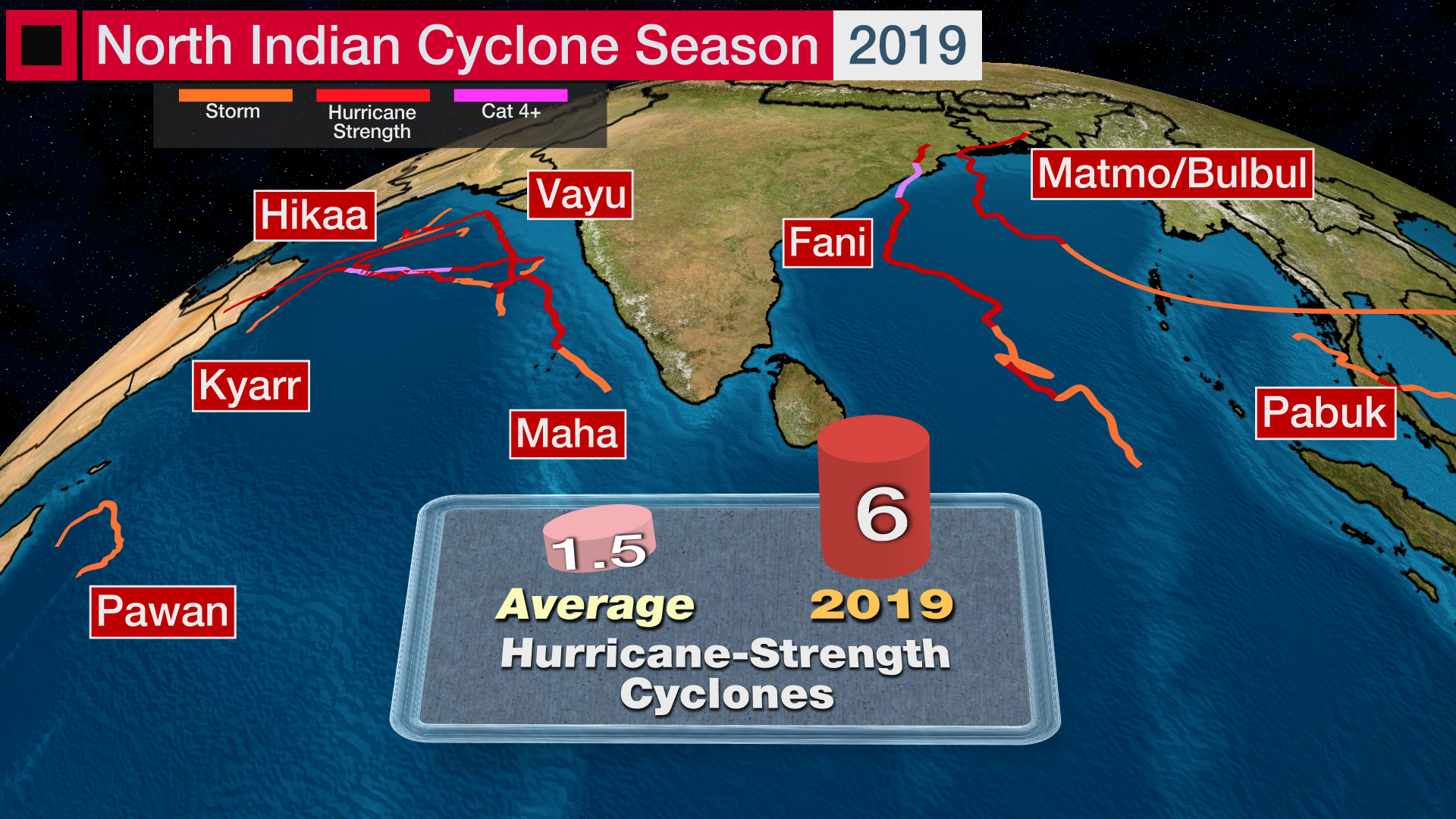 So far in 2019, there have been a record six "very severe cyclonic storms," which are roughly equivalent to a Category 1 hurricane in the Atlantic. This compares to an annual average of one to two of these storms.