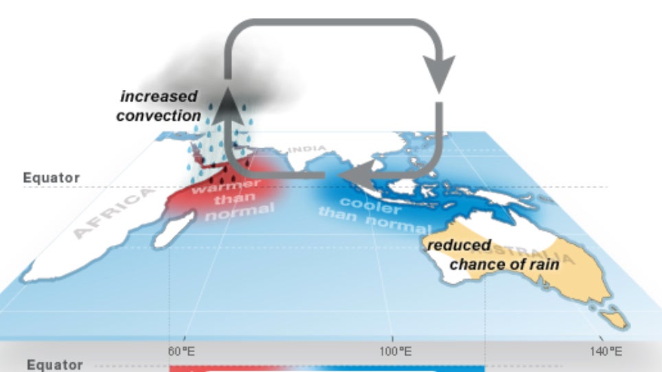 On the opposite end of the spectrum, the dipole is known to cause drier-than-average conditions for Southeast Asia and Australia.