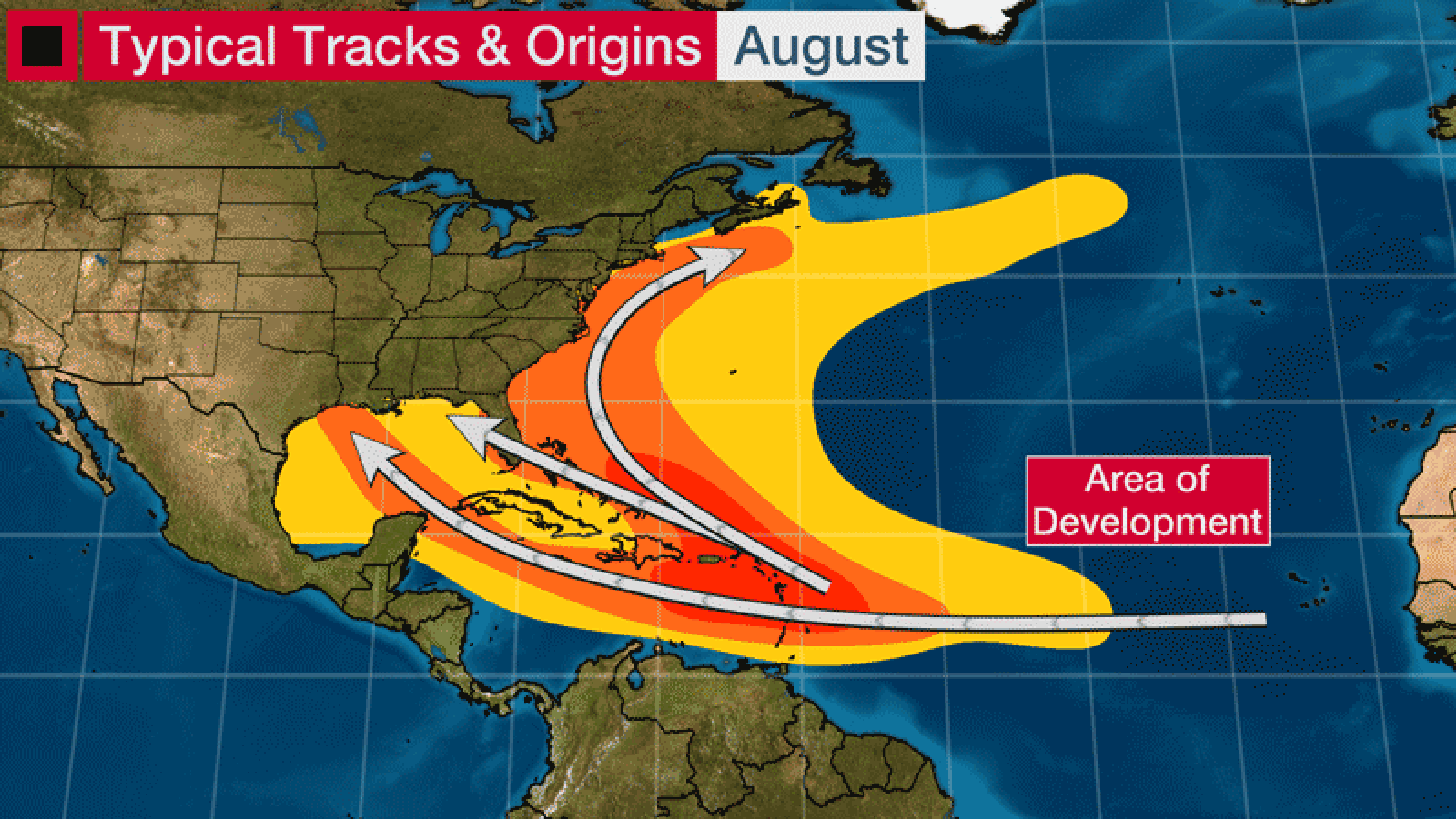All of those factors make for a larger area in the Atlantic where tropical storms and hurricanes can develop, compared to June and July.