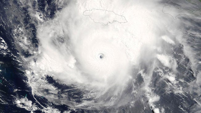 Visible satellite image of Hurricane Emily just before it reached Category 5 strength on July 16, 2005.