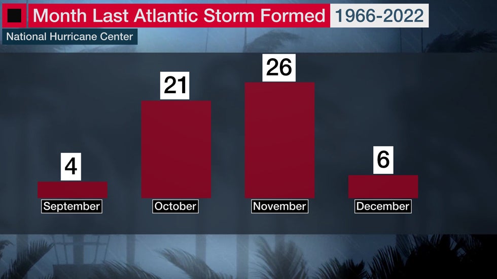 Early November is when the Atlantic has usually had its final named storm develop since the use of satellites began in 1966.