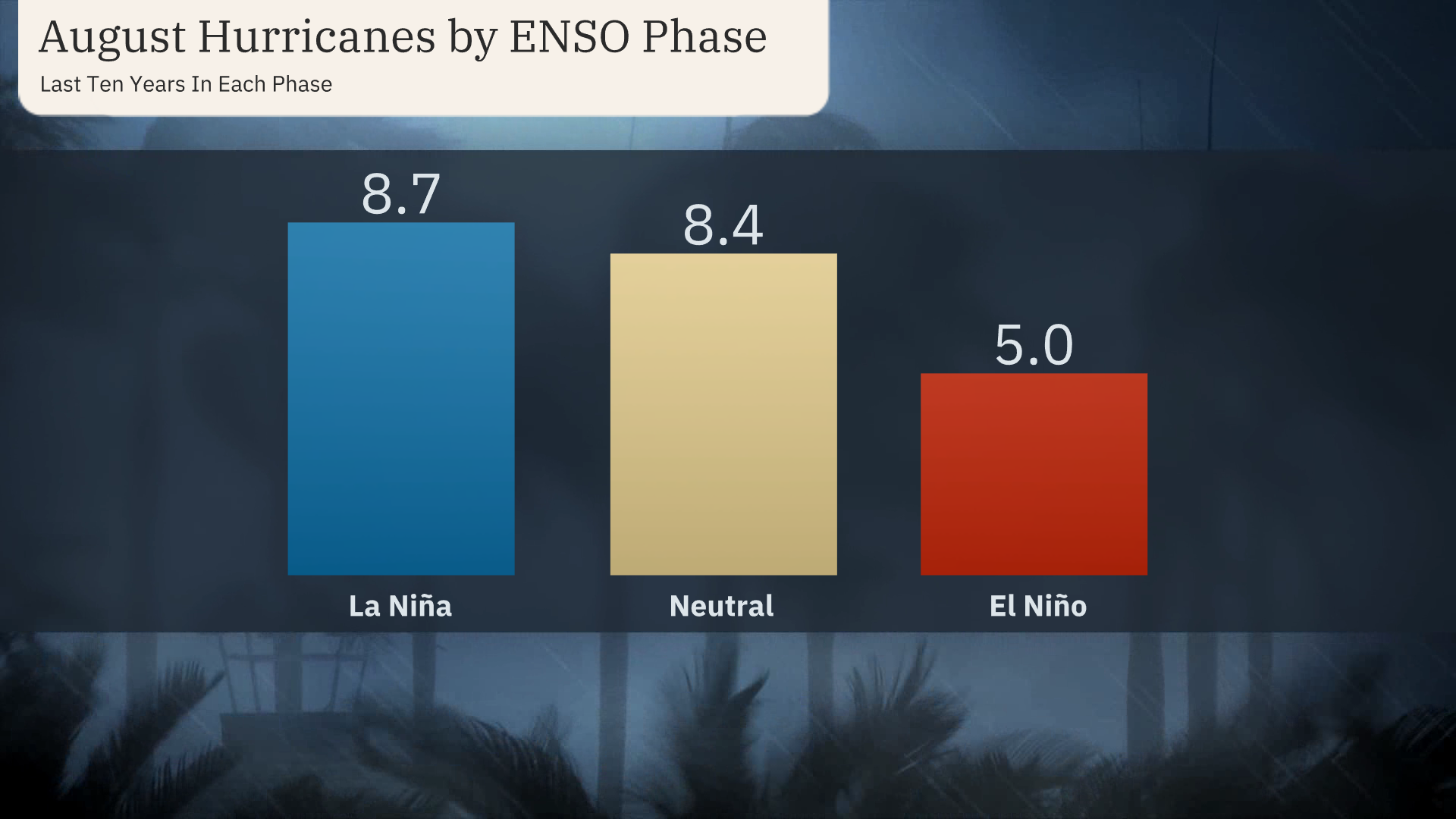 La Niña typically suppresses wind shear in the Caribbean and also allows for more atmospheric instability across the basin. That instability leads to thunderstorm growth and can eventually lead to hurricane development. Trade winds can also relax in the Main Development Region, which allows tropical waves to take their time crossing the Atlantic, allowing them more time to fester and develop.