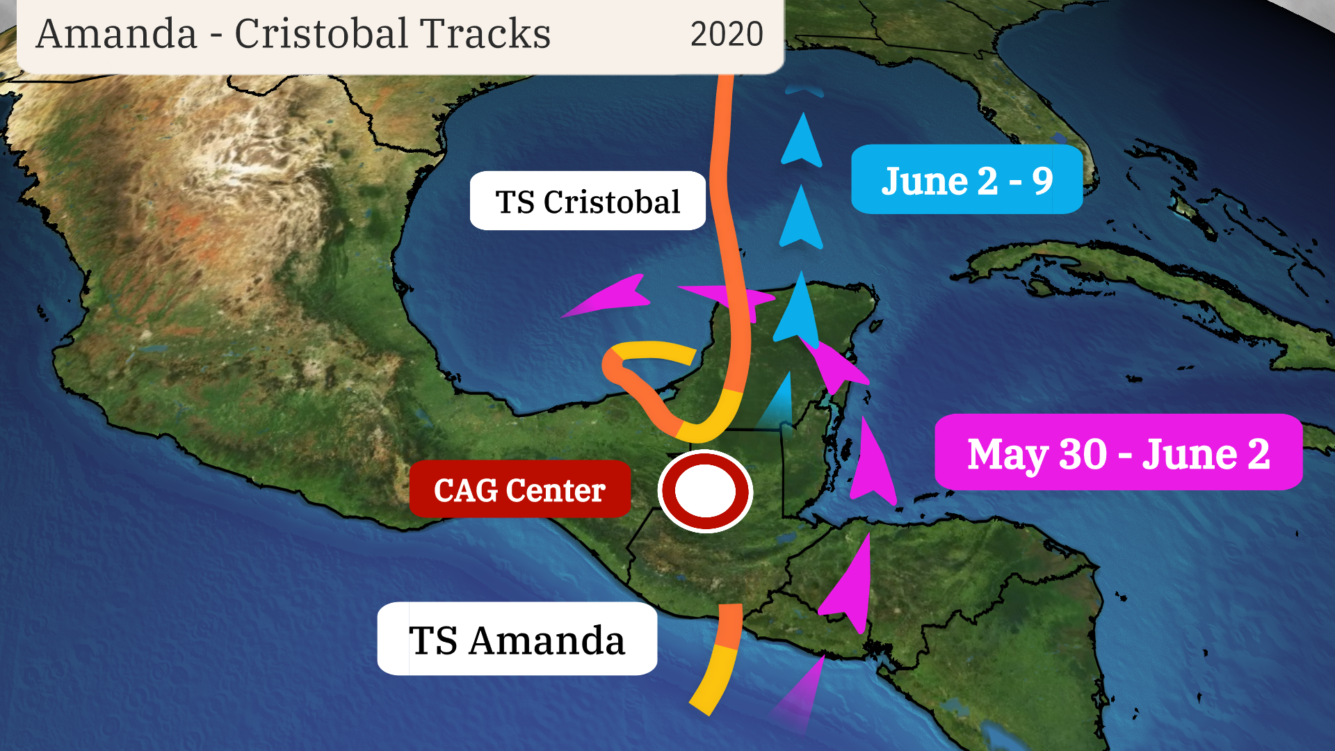The larger gyre pushed eastern Pacific Tropical Storm Amanda inland into Guatemala, then steered its remnant into the Bay of Campeche, where Tropical Storm Cristobal soon formed. The CAG forced Cristobal to make a weird loop over southeast Mexico before Cristobal finally turned north toward a Gulf Coast landfall on June 7, 2020.