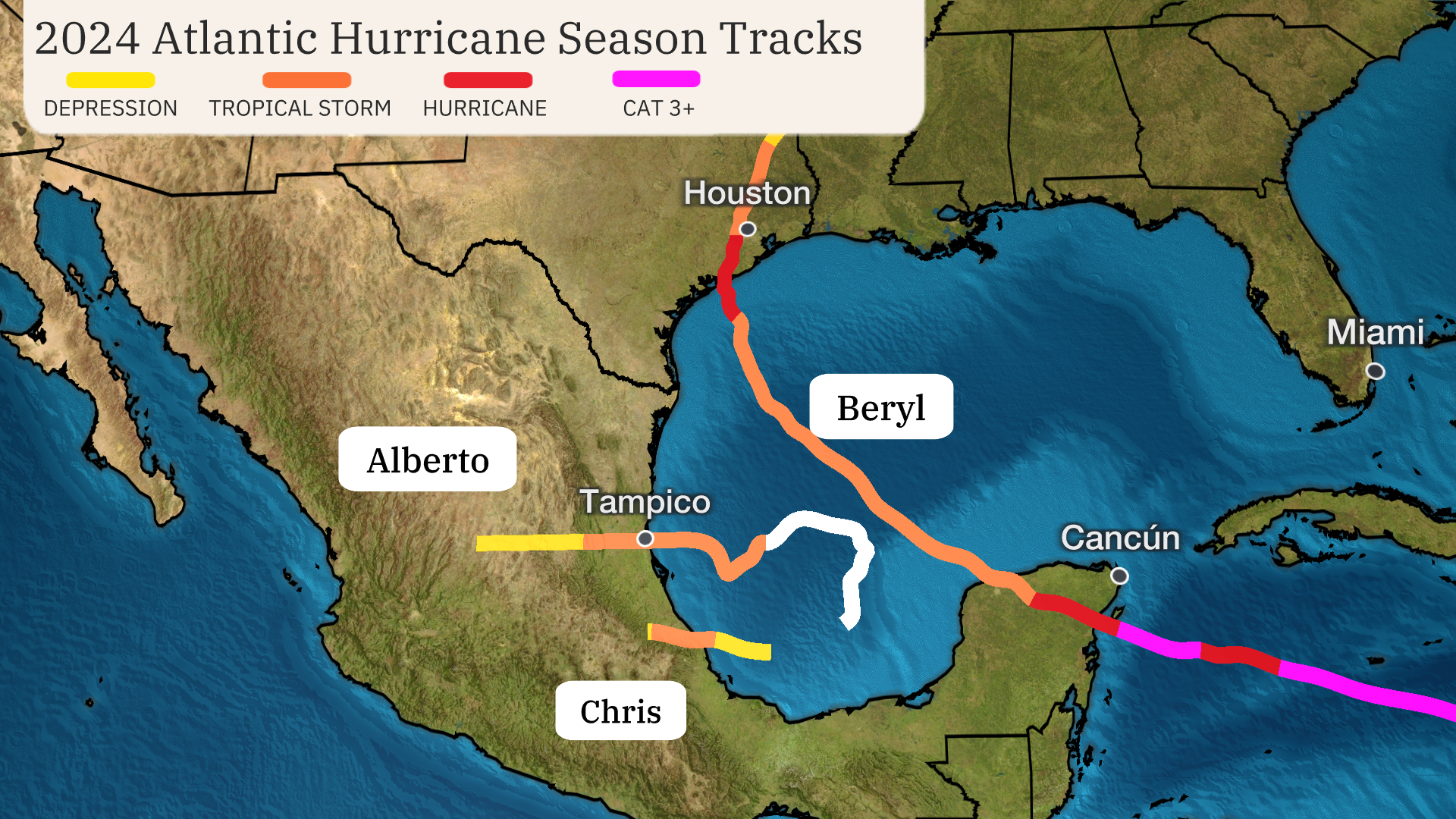 Tracks for Gulf and Caribbean Storms So Far In 2024