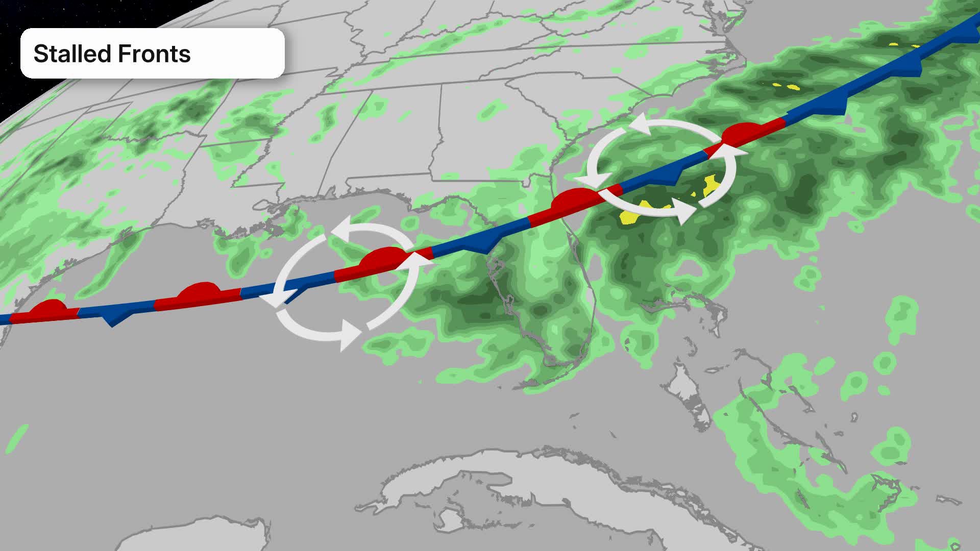 Example of a stalling front from the Gulf to off the Southeast coast. The white arrows rotating counterclockwise represent areas of low pressure trying to form where rain and thunderstorms are ongoing in green and yellow shadings.
