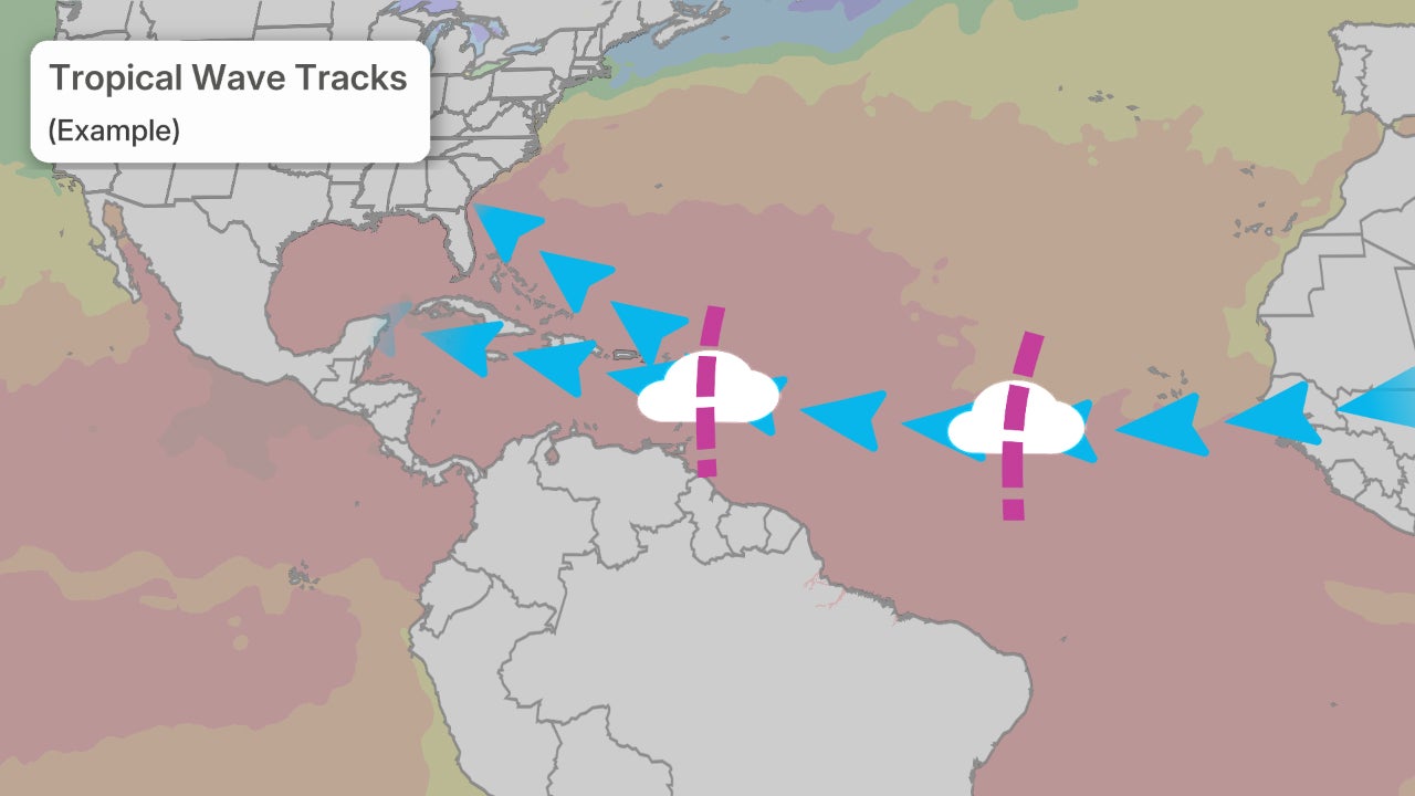 • Big Picture: Tropical waves are one of the most common seeds watched for tropical development as they move westward from Africa across the Atlantic Ocean toward the Caribbean Sea and Gulf. According to the National Hurricane Center, 60 tropical waves track across the Atlantic Ocean each year. Roughly one in five of these tropical waves becomes an Atlantic basin tropical depression, storm or hurricane.