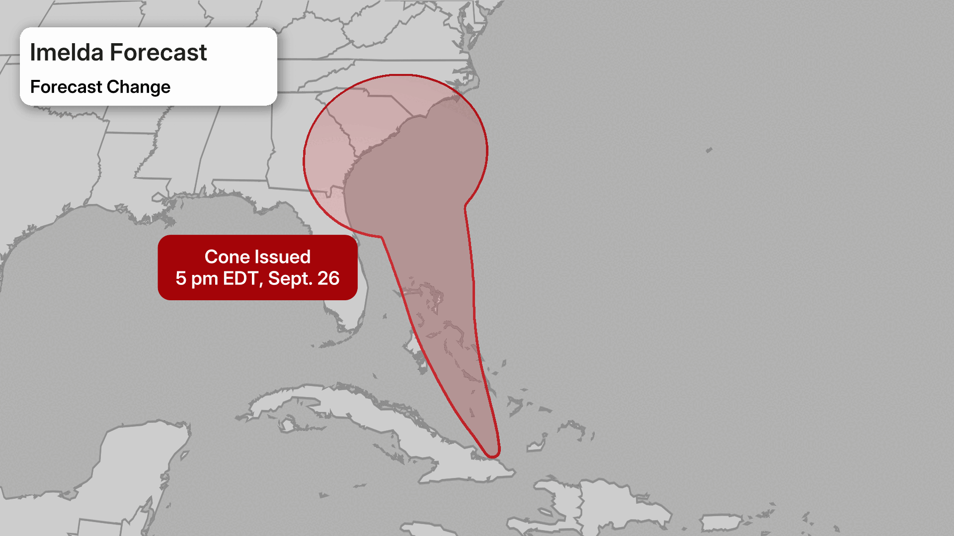 The forecast cones issued for Imelda 48 hours apart on Sept. 26, then on Sept. 28, 2025.
