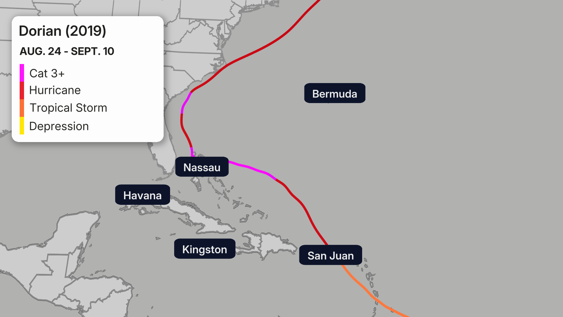 Dorian's history in 2019. The storm just barely exited the Caribbean before reaching hurricane strength.