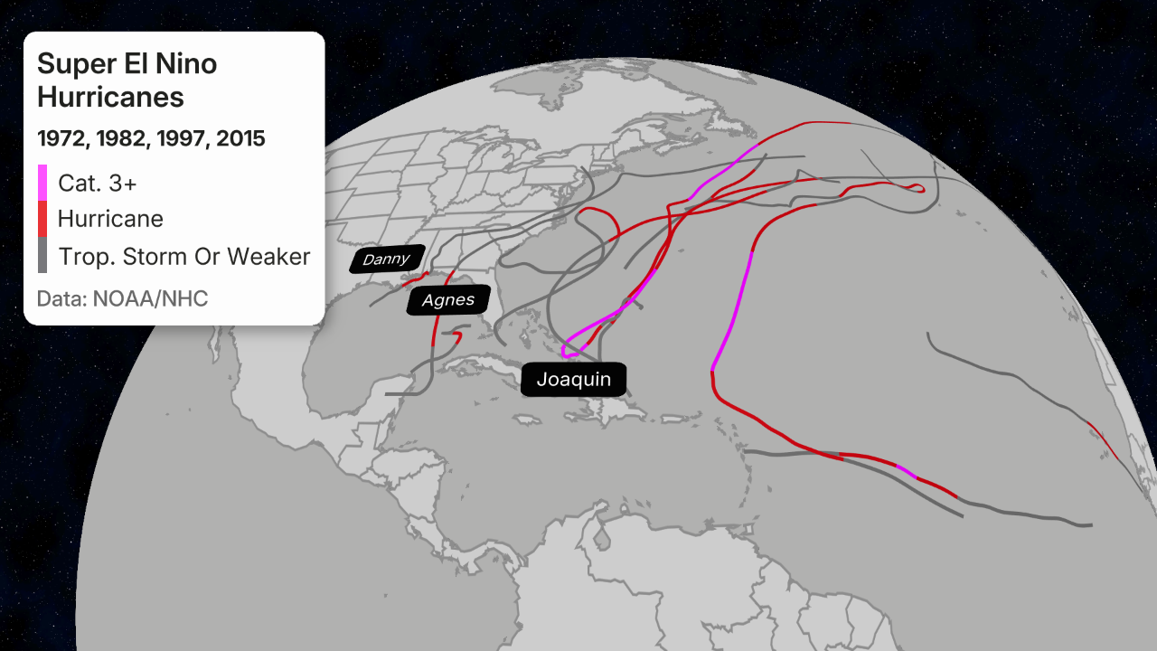 These are all the hurricanes to have occurred during seasons with at least a weak El Niño. Portions of tracks at hurricane and Category 3+ intensities are color coded.