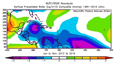 Anomalies in precipitable water from June through November 2012 through 2014. Cool colors (negative anomalies) correspond to drier than average air. Warm colors (positive anomalies) denote more moisture in the air than average.