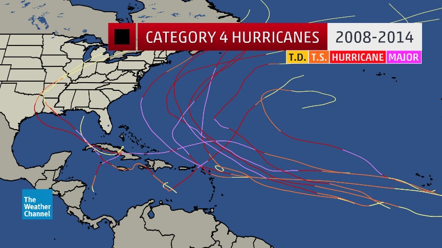 Tracks of all Category 4 hurricanes from the 2008 through 2014 Atlantic hurricane seasons.