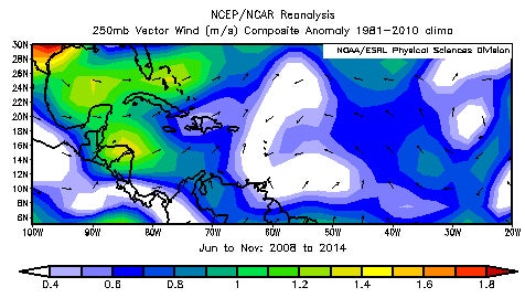 In the same seven hurricane seasons – 2008 through 2014 – the NOAA/ESRL analysis found anomalously strong westerly winds aloft in the Gulf of Mexico, much of the Caribbean Sea and near the Bahamas, roughly the same area lacking in even Category 4 hurricanes.
