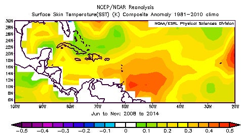 During the 2008 through 2014 Atlantic hurricane seasons, sea-surface temperatures were generally near or above average in the Atlantic basin, including the Caribbean Sea and Gulf of Mexico, according to an analysis from NOAA's Earth System Research Laboratory