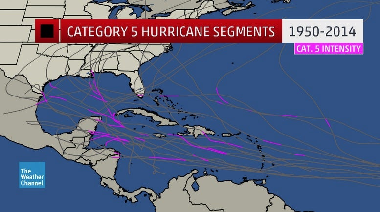 Category 5 Atlantic hurricane tracks from 1950-2014. Segments during which each hurricane was Category 5 intensity are highlighted in pink/purple.