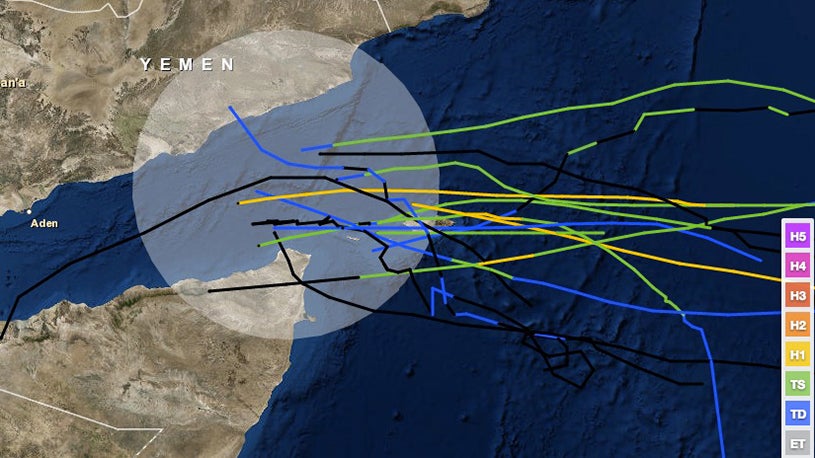 Tracks of tropical cyclones within 200 nautical miles of the mouth of the Gulf of Aden prior to 2015's Cyclone Chapala.